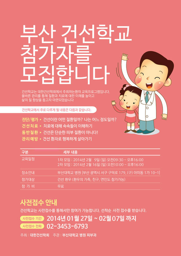 대한건선학회와 부산대병원 피부과가 2월 9일 오전 9시30분 부산대병원(아미동) 의전원행정회의실에서 '건선학교'를 개강한다.