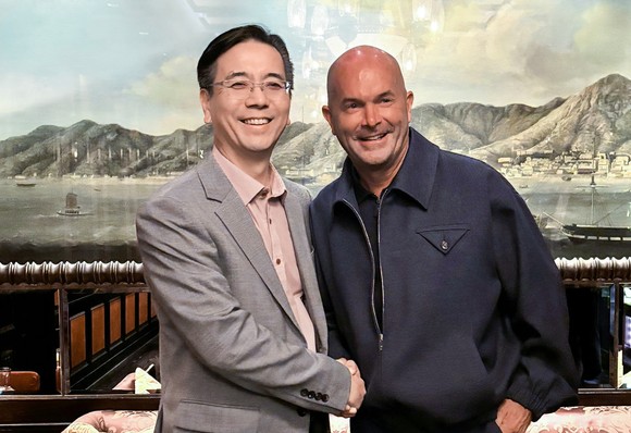 이한우 현대건설 대표(왼쪽)와 토비 노이게바우어 페르미 아메리카 CEO가 홍콩에서 미국 원전건설 EPC 본계약 후속 사업 진행에 대한 협력 방안 등을 논의한 후 기념촬영을 하고 있다. (사진=현대건설)