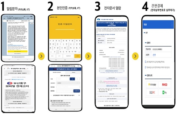 부산시가 기존 우편(종이) 방식으로 송달하던 지방세 고지·안내문을 전자문서 형태로 발송하는 ‘모바일 전자고지 서비스’를 2월부터 본격 시행한다고 4일 밝혔다. 이에 따라 시민들은 카카오와 KT·SKT·LGU+ 등 공인전자문서중계자를 통해 문자 메시지나 카카오톡으로 지방세 관련 안내를 받아볼 수 있게 된다.