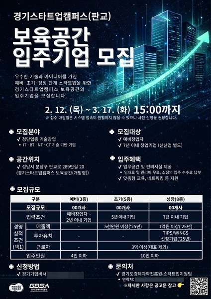 신청은 오는 12일부터 다음달 17일 오후 3시까지 경기기업비서에서 온라인으로 접수하면 된다. 최종 선정 결과는 4월 중 개별 통보되며, 선정된 기업은 5월부터 입주를 시작할 예정이다.