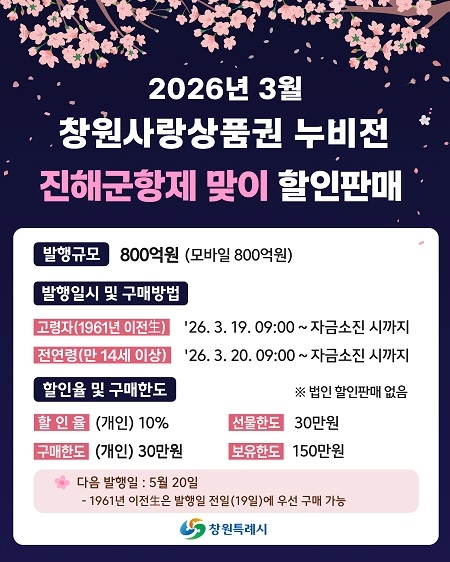 경남 창원시는 봄맞이 대표 축제인 진해군항제를 앞두고 관광객 소비를 지역 상권으로 연결하기 위해 800억 원 규모의 '모바일 창원사랑상품권(누비전)'을 발행한다고 4일 밝혔다.