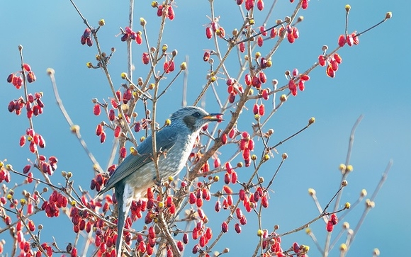 경칩을 하루 앞둔 4일 경남 함양군 하림공원 작은영화관 옆 산수유나무에서 직박구리가 산수유 열매를 쪼아 먹고 있다.