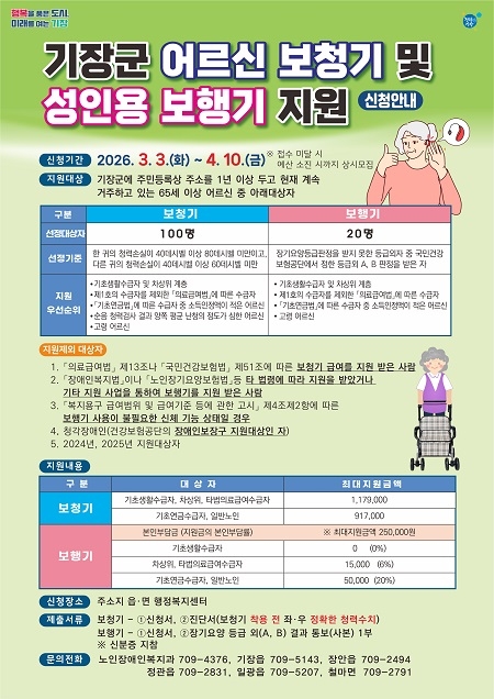 지원 대상은 2026년 3월 3일 기준 기장군에 주민등록상 주소를 두고 1년 이상 계속 거주한 65세 이상 어르신이다. 품목별 신청 자격을 충족해야 하며, 보청기나 성인용 보행기를 법령이나 다른 지원사업을 통해 이미 지원받은 경우에는 대상에서 제외된다.