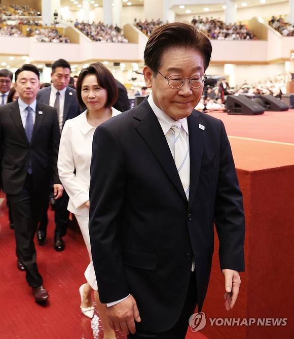 이재명 대통령이 5일 서울 여의도순복음교회에서 열린 부활절 연합예배에서 축사를 마친 뒤 대성전을 나서고 있다. (사진=연합뉴스)