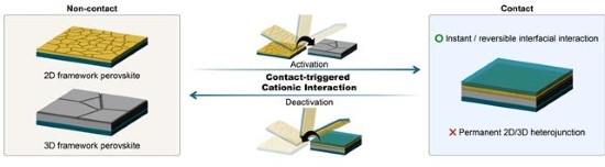 페로브스카이트는 습기나 열에 민감해 성능이 저하되지 않도록 첨가제를 넣거나 표면에 화학약품 처리를 해야만 했다. 연구팀은 이 문제를 해결하기 위해 페로브스카이트 2차원 박막과 3차원 박막을 각각 따로 만든 뒤에 단순히 맞닿게 하는 실험을 설계했다. 그 결과 영구적인 화학반응이나 접합 형성 없이 두 층이 맞닿기만 해도 새로운 양이온 상호작용이 나타나고, 떨어지면 다시 원래 상태로 돌아가는 가역적 변화를 발견했다고 설명했다.