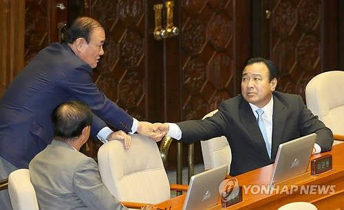 ▲새누리당 송광호 의원이 3일 국회 본회의에서 자신의 체포동의안에 대한 표결 이후 개표가 끝나갈 무렵 이완구 원내대표에게 찾아가 인사하고 있다. 국회는 이날 오후 본회의에서 철도 부품 제작업체로부터 금품을 받은 혐의로 구속영장이 청구된 송광호 의원 체포동의안을 표결해 부결시켰다.(사진=연합뉴스)