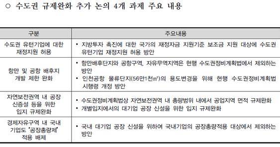 이들은 수도권 유턴기업에 대한 재정지원 허용과 항만 및 공항 배후지 개발 제한 완화, 자연보전권역 내 공장 신증설 등을 위한 입지규제 완화, 경제자유구역 내 국내기업도 공장총량제 적용 배제가 그것이다.