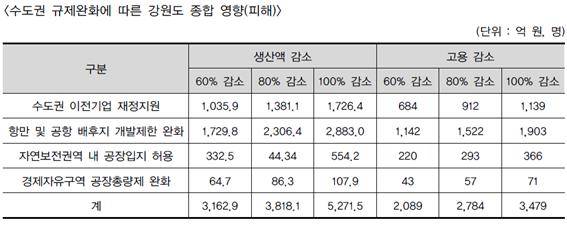 정부의 투자활성화 대책이 오히려 강원도 경제를 더욱 황폐하게 할 것이란 분석결과가 나왔다. 정부가 경기회복을 위해 수도권 유턴기업에 대한 재정지원 허용 등 수도권 규제완화 추가 논의 4개 과제를 실시할 경우 강원도는 연간 최대 5272억원의 재적 생산액 손실과 이로 인해 매년 3479명의 고용이 감소할 것이란 전망이 제시됐다.