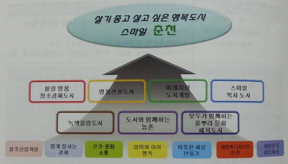 춘천의 미래상은 '살기 좋고 살고 싶은 행복도시 스마일 춘천'이다. 이는 춘천의 지역적 특성을 고려해 환경과의 조화와 주민의 삶을 질 제고 등 미래도시가 갖추어야 할 가치를 담은 것으로 이를 통해 국제경쟁력을 갖춘 힐링명품창조도시로 만든다는 구상이다. 이를 위해 2015년부터 오는 2018년까지 2조95억9200만원이 투자되는 장기프로젝트다.