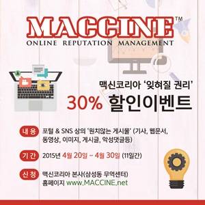 온라인 평판 관리 전문업체 맥신코리아는 20일부터 30일까지 삼성동 무역센터 맥신코리아 본사와 홈페이지를 통해 잊혀질 권리 30% 할인 행사를 실시한다.