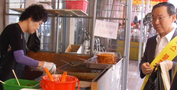 ▲양희봉 강원지방중소기업청장이 메르스 여파로 매출이 감소한 춘천시내 한 전통시장을 방문해 간식거리를 사 먹으며 상인들을 격려하는 모습. (사진=강원지방중소기업청)