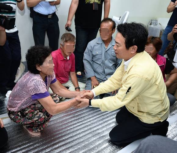 ▲지난 8월21일 오전 남경필 경기도지사가 연천군 중면면사무소에 위치한 대피시설을 방문해 지역주민들의 애로사항을 청취하며 위로하는 모습(사진=경기도)