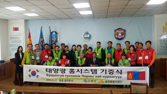 수원시가 몽골 날라흐시와 튜브아이막 에르덴솜에서 소형 태양광발전기 기증식을 개최해 이 지역 주민에게 가정용 태양광 홈시스템 55세트를 전달했다.