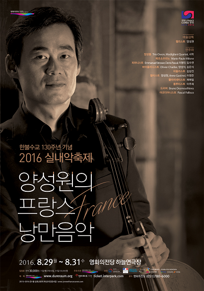 특히 이번 영화의전당 실내악축제는 첼리스트 양성원(현재 연세대 교수, 영국 로열 아카데미 오브 뮤직 초빙교수)이 예술감독을 맡아, 양국 문화와 예술을 함께 이해하고 교류하고자 특별 기획됐다. 모두 7회에 걸쳐 진행되는 이번 공연에서는 프랑스를 대표하는 작곡가 포레, 라벨, 뒤티외, 메시앙 등의 주옥같은 작품들을 선보이며, 세련된 감각과 서정미가 가득한 실내악의 향연이 펼쳐진다.