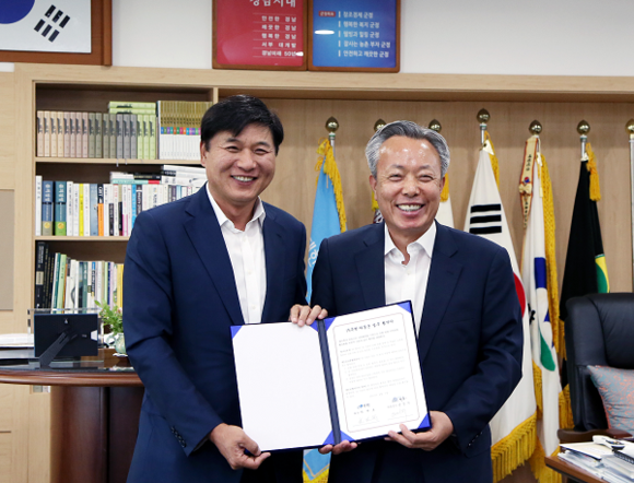 ▲왼쪽부터 최재호 무학 회장, 윤상기 하동군수. (사진=무학)