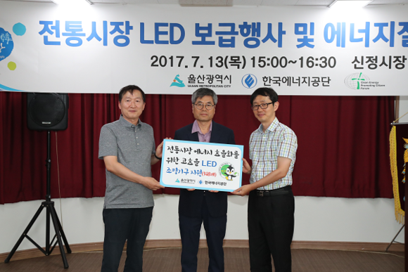 ▲울산시 이영환 과장, 에너지공단 이철우 부울본부장이 고효율 LED 148개를 신정시장에 전달하고 있다.
