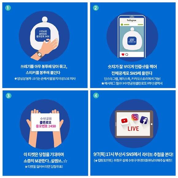 응모기간은 오는 25일부터 내달 3일까지며, 쓰레기를 봉투에 넣어 묶은 다음 '클린로또' 스티커를 봉투에 붙여 인증샷을 개인 SNS(페이스북·인스타그램·카카오스토리)에 올리면 응모가 완료된다. '클린로또' 스티커는 광안역 고객센터, 인근 편의점(GS 민락수변공원점·세븐일레븐 부산수변공원점·미니스톱 민락수변공원점) 및 인근 회센터에서 배포할 예정이다.