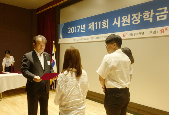 ▲시원공익재단이 23일 부산·울산·경남지역 예비사회복지사들에게 '시원장학금'을 전달했다. (사진=BN그룹)
