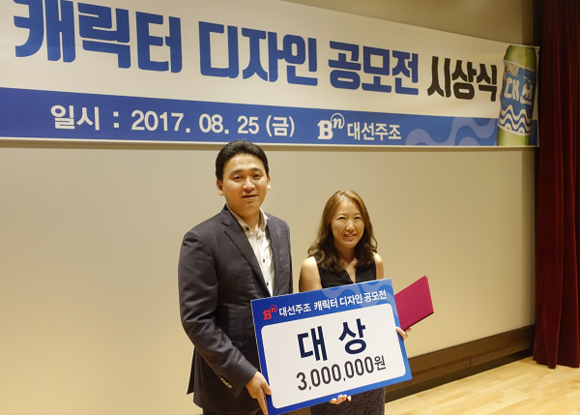 ▲대선주조 조우현 대표(왼쪽)가 '제1회 대선주조 캐릭터 디자인 공모전'에서 대상을 차지한 마수정씨와 기념촬영을 하고 있다.