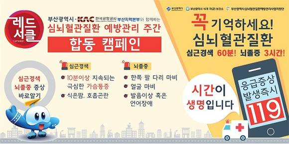 주요 행사로는 내달 1일 오전 10시부터 오후 4시까지 김해국제공항 국내선 2층 대합실에서 부산시 및 심뇌혈관질환 예방관리사업지원단, 16개 구(군)보건소 등과 공동으로 김해공항 이용객 5000여 명을 대상으로 '심뇌혈관질환 예방관리주간 합동캠페인'을 개최한다.