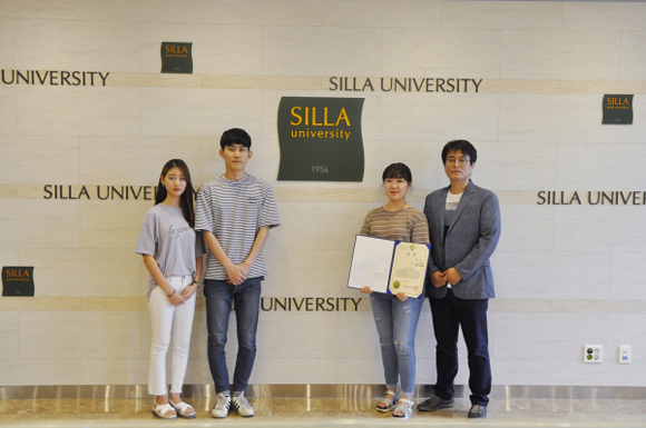 ▲왼쪽부터 대상 수상자인 전지선, 이태규, 문정현 씨, 박상준 지도교수. (사진=신라대)