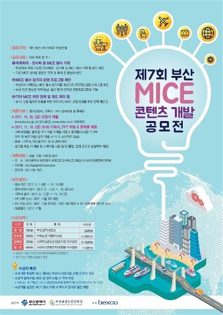 부산시는 지역의 특성과 조건 등을 고려한 참신하고 다양한 콘텐츠 개발로 MICE 산업의 지속 가능한 성장 동력을 개발하고 수상작의 신규 MICE 행사 개최를 통해 MICE 산업을 활성화하기 위해 (사)부산관광컨벤션포럼과 함께 '제7회 부산 MICE 콘텐츠 개발 공모전'을 개최한다.