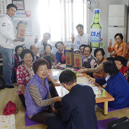 ▲대선주조 임직원들이 어르신들과 사직3동 여명모범경로당에서 소방시설 전달 후 기념촬영을 하고 있는 모습. (사진=대선주조)
