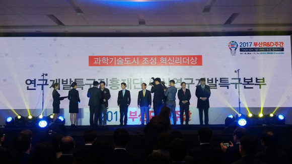 연구개발특구진흥재단 부산연구개발특구본부(본부장 송한욱)는 30일 해운대 벡스코에서 열린 2017 부산R&D주간 행사에서 '과학기술도시 조성 혁신리더상'을 수상했다. (사진=부산연구개발특구)