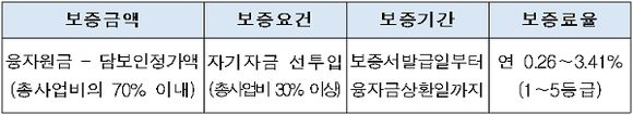 보증요건으로 사업자는 자기자금으로 총사업비의 30% 이상을 보증대상 사업에 투입해야 한다. 보증기간은 보증서 발급일로부터 융자금 상환일까지로, 보증료율은 보증심사 등급(1~5등급)에 따라 연 0.26~3.41% 범위에서 결정된다. 보증심사는 대표자 신용도, 입지 여건 및 자기자금 투입비율 등을 주요 심사항목으로 하여 사업성을 평가한다.