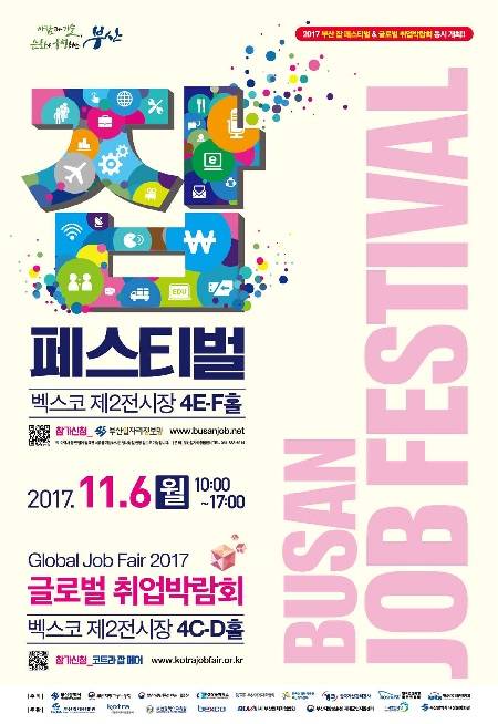 또한 지난해에 이어 고용노동부가 주최하고 KOTRA와 한국산업인력공단이 공동 주관하고 부산시가 후원하는 '2017 하반기 글로벌 취업박람회'가 동시에 개최된다. 이번 행사에는 닛산, 소프트뱅크테크놀러지, 펜 퍼시픽호텔 싱가포르 등 세계 유망기업 100여개가 참가해 높은 관심 속에 열띤 1:1 취업상담(채용면접)을 진행한다.