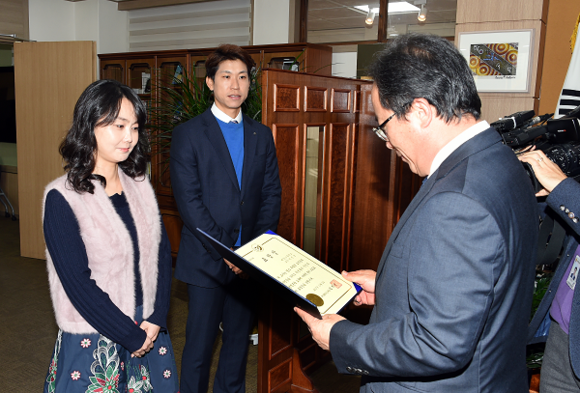 김석준 부산시교육감이 2일 오전 교육감실에서 '골드타임 4분의 기적'으로 심장마비로 쓰러진 학생을 살려낸 부산 해강고등학교의 이용선 체육교사와 전민경 보건교사 등 교사 3명에게 공적상을 수여했다.