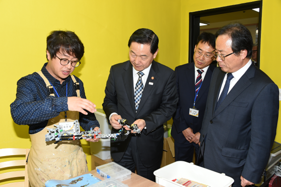 ▲김상곤 부총리 겸 교육부장관과 김석준 부산시교육감이 학생들이 공예수업 시간에 블록장난감으로 만든 작품을 보고 있다.