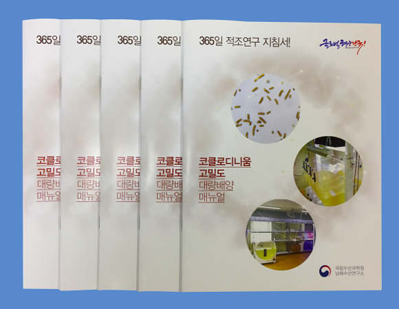 남해수산연구소는 코클로디니움 대량배양 기술을 `14년부터 개발하기 시작해, `15년 중밀도(5천개체/㎖)로 500리터 배양에 성공하고, `16년 고밀도(1만개체/㎖)로 500리터 배양 기술을 개발해, 현재 대량 배양시스템을 구축해 연구용으로 분양하고 있다.