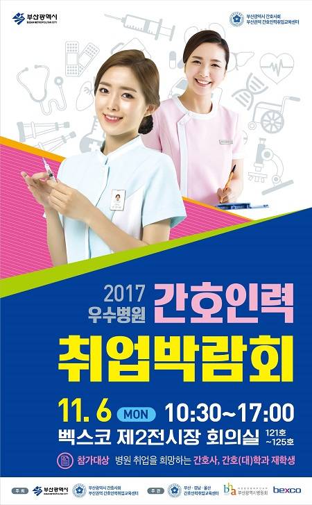 '우수병원 간호인력 취업박람회'는 부산시, 부산시간호사회, 부산권역 간호인력취업교육센터가 주최하고 벡스코, 부산시병원회, 부산·울산·경남 간호인력취업교육센터가 공동 주관해 운영하며, 부산지역 최초의 대표 우수병원들과 전문 간호 인력들이 한자리에 모이는 전문분야 맞춤형 취업박람회다.