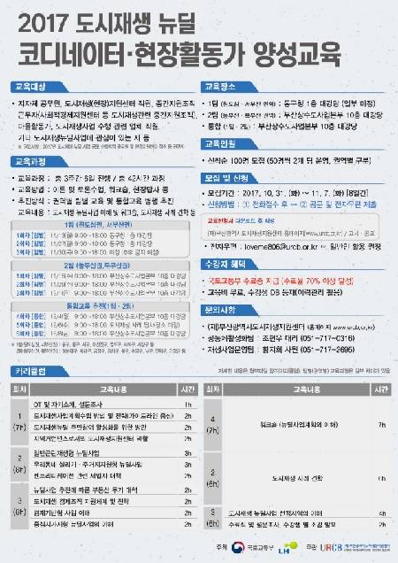 시와 (재)부산광역시도시재생지원센터가 공동으로 추진하는 이번 교육은 국정과제인 도시재생 뉴딜 사업에 맞춰 진행되며, 도시재생 뉴딜사업의 코디네이터·마을활동가를 양성하기 위한 프로그램으로 마련됐다. 도시재생 수요가 대폭 증가가 예상되는 만큼 교육을 통한 정책방향 공유 및 전문가 양성 확대를 위해 국토교통부의 예산을 지원받아 전국적으로 시행되고 있다.