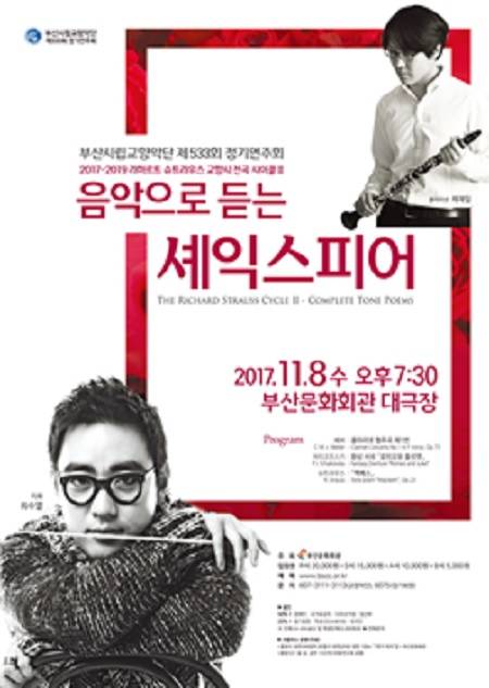부산시립교향악단과 최수열 상임지휘자의 두 번째 무대인 이번 공연은 차이코프스키의 환상서곡 '로미오와 줄리엣', R.슈트라우스의 '맥베스' 등 셰익스피어의 원작을 관현악곡으로 재구성 한 작품들로 열린다.