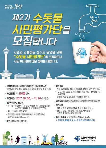 부산시 상수도사업본부(본부장 김종철)에서는 오는 20일까지 음용률 향상 제고를 위한 '수돗물 시민평가단' 시민대표 120여 명을 모집한다고 8일 밝혔다.