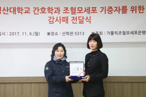 와이즈유 영산대학교(총장 부구욱) 간호학과가 지난 6일 가톨릭대학교 의과대학 가톨릭조혈모세포은행으로부터 조혈모세포 기증 감사패를 받았다.