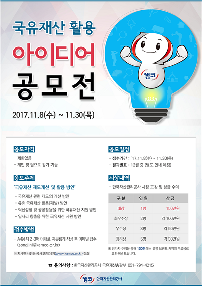 한국자산관리공사(캠코)는 오는 30일까지 '국유재산 활용 아이디어' 공모전을 진행한다고 8일 밝혔다.