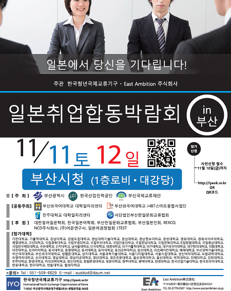 한국청년국제교류기구(IYO)와 ㈜East Ambition이 주관하고 부산시, 부산국제교류재단, 한국산업인력공단이 주최하는 '일본취업합동박람회 in 부산'이 오는 11~12일 부산시청 1층 로비와 대강당에서 개최된다.