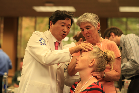 ▲자생한방병원 신준식 박사(왼쪽)가 미국 미시건주립대에서 정골의사들을 대상으로 보수교육을 실시하고 있다. (사진=자생한방병원)