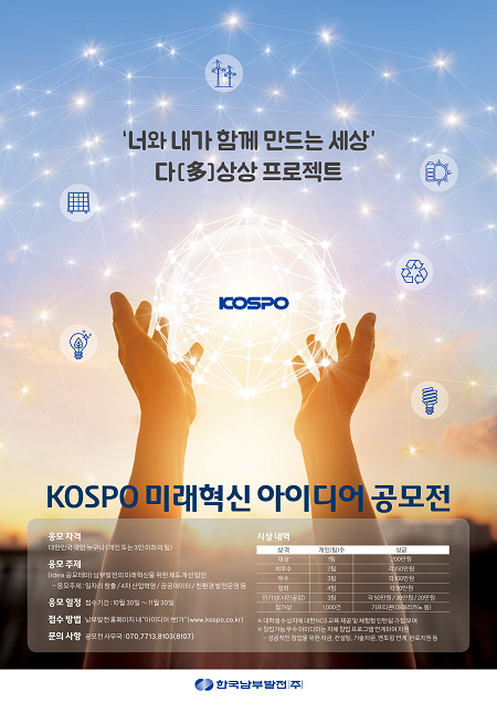 한국남부발전(사장직무대행 이종식)은 오는 30일까지 홈페이지를 통해 'KOSPO 미래혁신 아이디어 공모전'을 연다고 13일 밝혔다.