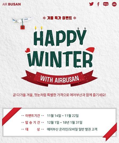 지역 항공사 에어부산(사장 한태근)이 오는 14일부터 '겨울맞이 특가 항공권 이벤트'를 실시한다.