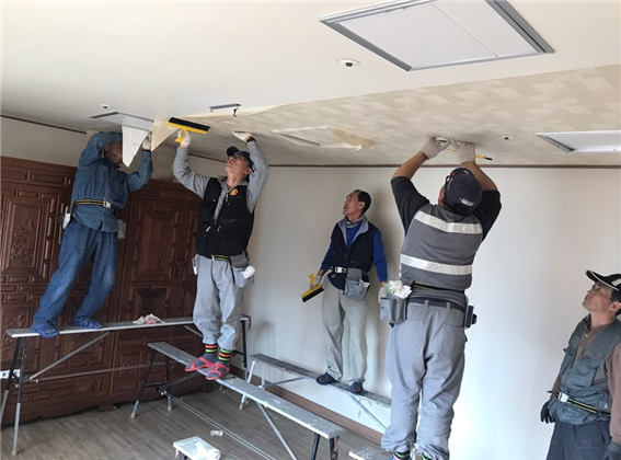 울산시가 추진하고 있는 '중장년층 재취업 훈련사업' 교육생 30여 명이 13일~17일(5일간) 울주군 웅촌면 노인장기요양기관 '쉴만한 물가'를 방문해 도배, 방충망 교체, 전기점검, 외벽 보수 등 현장실습을 겸한 집수리 봉사활동을 펼치고 있다.