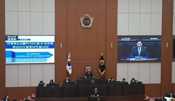 부산시의회 박대근 의원(해양교통위원회)은 제266회 정례회 본회의 5분자유발언을 통해 부산시와 부산시교육청에 청소년보호처분대상 청소년들의 대안가정인 '청소년회복센터'의 지원 확대와 제도적 기반 마련을 촉구했다.