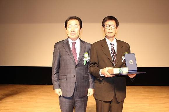 ▲제78회 순국선열의 날 기념식, 부산지역 독립유공자 포상대상자 故김기석 선생의 외손자인 황정기씨(오른쪽)가 대신 상을 받았다. 왼쪽(부산시 기획관리실장 홍기호). (사진제공=부산지방보훈청)