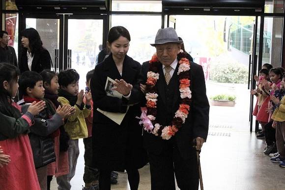 ▲제78회 순국선열의날 기념식, 법륜유치원 원생들의 환영을 받고 있는 김병길 지사님. (사진제공=부산지방보훈청)