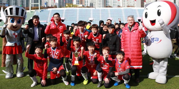 ▲캠코가 18일 부산 구덕운동장에서 개최한 '캠코 희망울림 FC' 어린이 축구단 리그전에서 문창용 캠코 사장(오른쪽 첫번째)과 최만희 부산아이파크 대표(왼쪽 첫번째)가 우승한 정관초등학교에 우승컵을 수여한 후 기념촬영을 하고 있다. (사진제공=캠코)