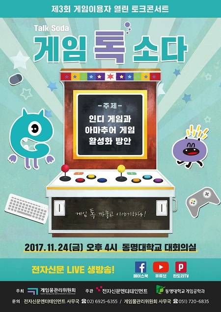 게임물관리위원회(위원장 여명숙)는 오는 24일 오후 4시 부산 동명대 중앙도서관 대회의실에서 '게임 톡(Talk) 소다(Soda) 제3차 토크콘서트'를 개최한다고 20일 밝혔다.