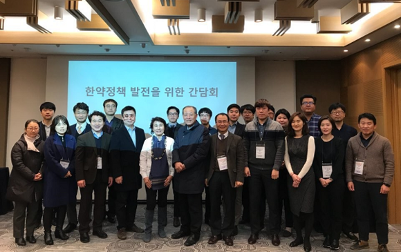 ▲식약처 주최 '한약정책 발전 간담회'에 참석한 한·양방 분야별 전문가들이 기념촬영을 하고 있다.